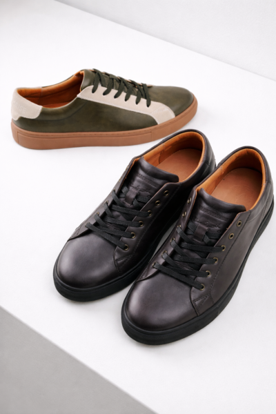 Low top graphite, cordovan and olive leather, sneakers in a classic style. Round toe. Embossed logo at heel counter. Lion embossed leather lining.