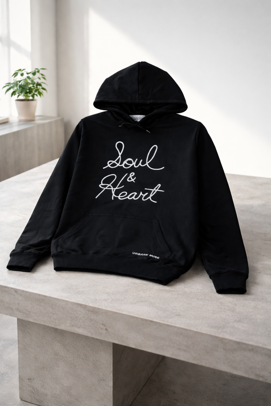 Cotton/poly blend hoodie. Soul & Heart graphic sketch hand drawn by CHRIS SMITH®, embroidered at chest. URBANE MUSE embroidered at pouch pocket.
